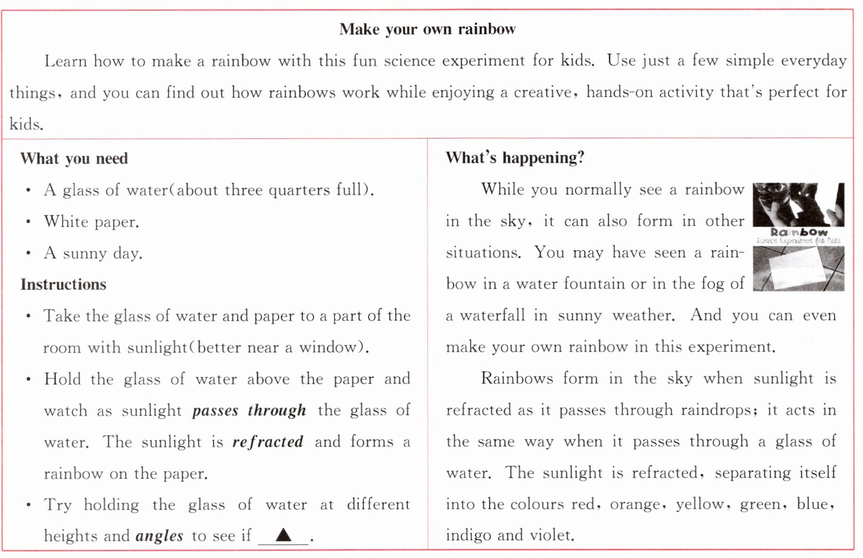 阅读理解 [A] BDCDB [A] 本材料介绍了自己动手制作彩虹的实验步骤。1. B 细节理解题。由Instructions中Take the glass of water and paper to a part of the room with sunlight可知,最好在晴天做这项实验。2. D 推理判断题。上文提及生成彩虹后接着尝试以不同的高度和角度拿着一杯水,此处对应表示:看看是否有不同的效果。3. C 推理判断题。由Rainbows form in the sky when sunlight is refracted as it passes through raindrops可知,彩虹的形成需要具备的两个条件是阳光与雨滴。4. D 细节理解题。由“... separating itself into the colours red, orange, yellow, green, blue, indigo and violet.”及常识可知,彩虹有七种颜色。5. B 推理判断题。本文介绍制作彩虹的过程,由全文及常识可知,彩虹的形成涉及光的折射现象,这是物理知识,因此最有可能在物理课做这个实验。