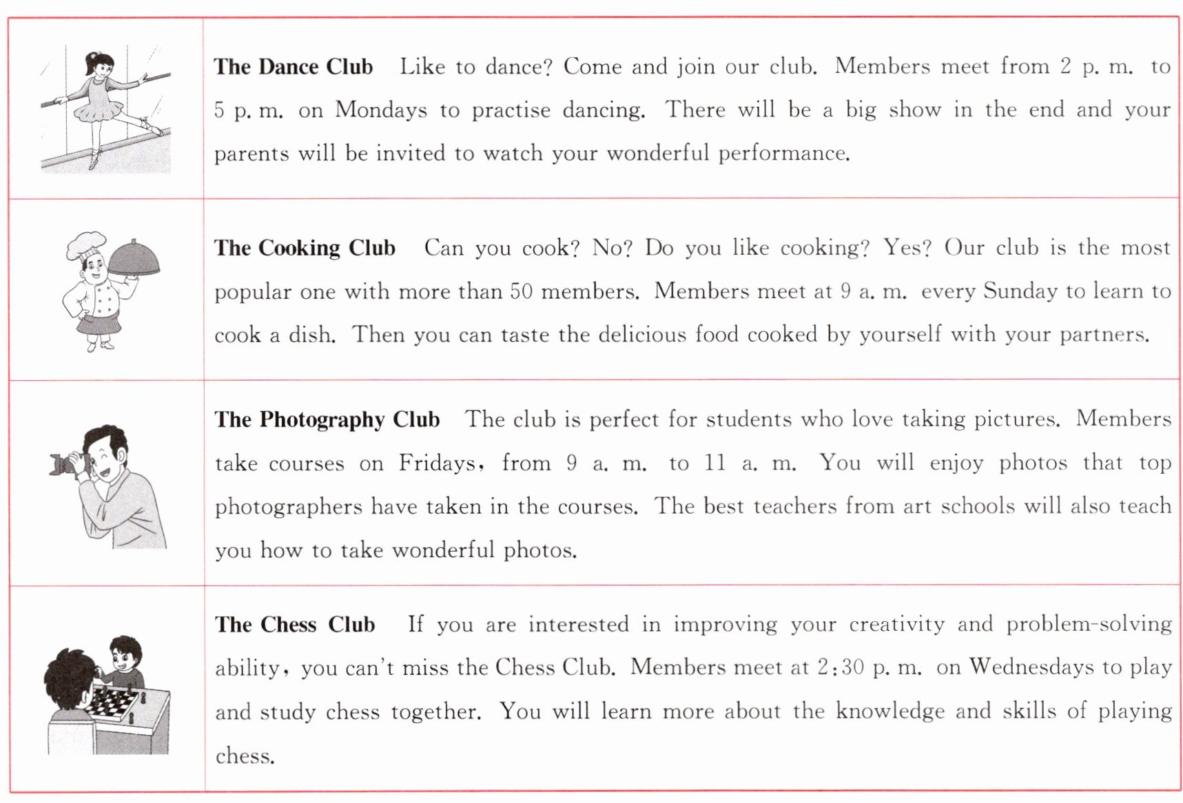 )2. If Kate wants to learn how to make delicious food, what club can she join?A. The Chess Club. B. The Dance Club.