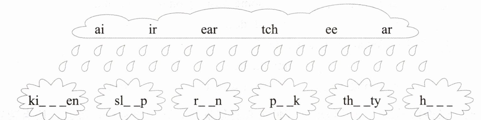 一、又是一个炎热的夏天,天气预报说今天要下雨。花儿们都在等待着雨水的到来,快来连一连,看看雨点会落在哪片花朵上。