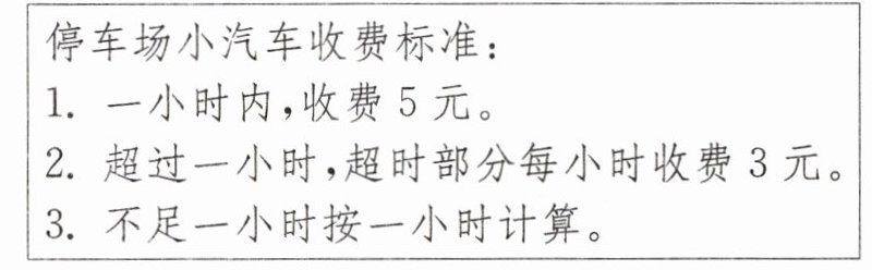 5+(5-1)×3=17(元) 【提示】从上午 9 时到下午 1 时 30 分共停车 4 小时 30 分钟,4 小时 30 分钟按 5 小时计算。