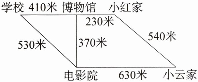 3. 小红从家到电影院,走最近的一条路,一共要走( )米。