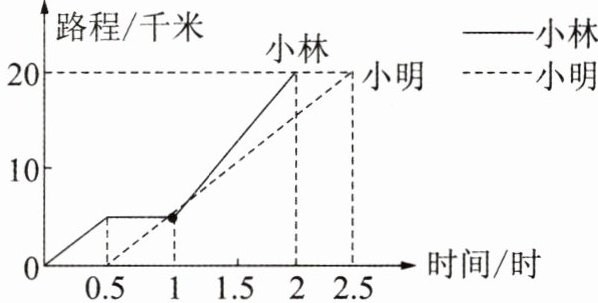 3. 小林和小明骑自行车从学校沿着同一条路线到20千米外的公园,已知小林比小明先出发,他们俩所行的路程和时间的关系如图所示。下面说法正确的是(