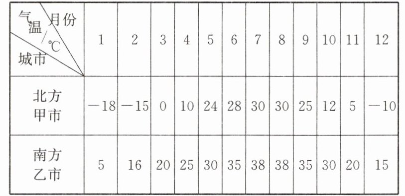 五、已知北方甲市和南方乙市2019年各月平均气温如下表。