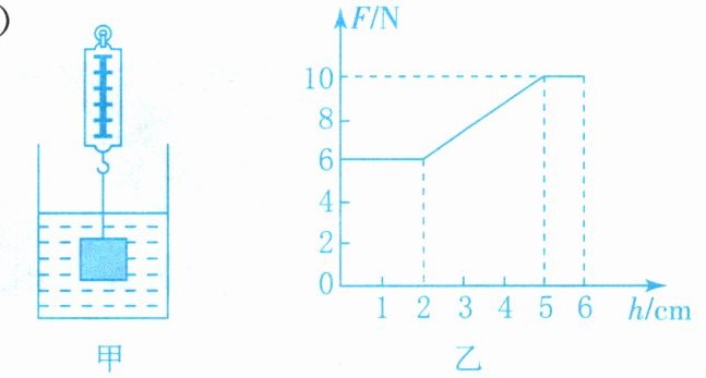 5. 如图甲,弹簧测力计下挂有一个圆柱体,把它从盛水的烧杯中缓慢提升,直到全部露出水面,如图乙是该过程中弹簧测力计读数F与圆柱体上升高度h的关系。则圆柱体(忽略水面的变化) (