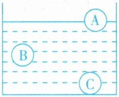 6. 将体积相同的三个小球放入水中静止,制作三个小球的材料密度关系是$ρ_{B}>ρ_{C}>ρ_{水}>ρ_{A}$,如图所示。下列判断正确的是 (