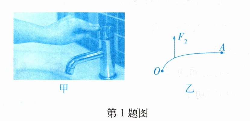 1. “节约用水,人人有责。”如图甲是用水后及时关闭水龙头时的情景,我们可以将水龙头手柄看作一个杠杆,向下按关水。请你在图乙所示的示意图中画出阻力臂$l_{2}$,并画出施加在A点的最小动力$F_{1}$。
