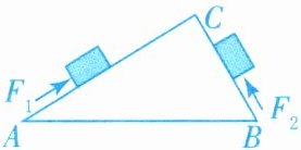 5. 如图所示,$ AC>BC $,在相同时间内把同一物体分别沿斜面 AC、BC 匀速推上顶端,推力分别为 $ F_{1} $、$ F_{2} $,功率分别为 $ P_{1} $、$ P_{2} $,在不考虑摩擦的情况下(