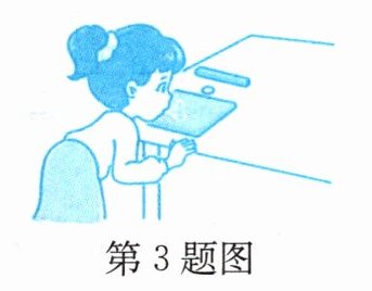 3. 在离桌边约20 cm的地方放一枚铝质硬币,在硬币前10 cm左右放置一个高度约2 cm的木块,在硬币后放置一本与硬币厚度相当的笔记本,如图所示。在硬币上方沿着与桌面平行的方向用力吹一口气,硬币跳过木块。实验结果表明:在气体中,流速越大的位置,压强越