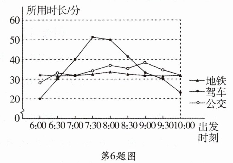 6. 从甲地到乙地有驾车、公交、地铁三种出行方式. 数学课外小组的同学对6:00~10:00时段不同出发时刻,从甲地到乙地的三种出行方式所用时长进行调查、记录与整理,得到如图所示的数据. 根据统计图提供的信息,下列推断不合理的是 (