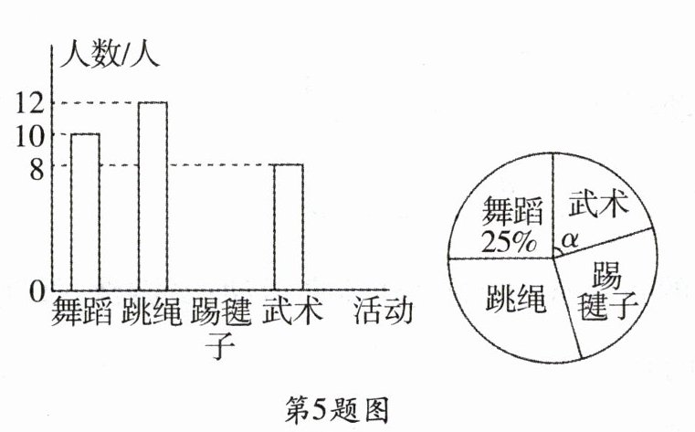 5. 为提高学生的身体素质,某校组织了四项特色活动:舞蹈、跳绳、踢毽子、武术,要求每名学生任选一项进行锻炼,小明从全校1200名学生中随机调查了部分学生,对他们所选活动进行了统计,并绘制了尚不完整的条形统计图和扇形统计图,如图所示,下列结论错误的是 (