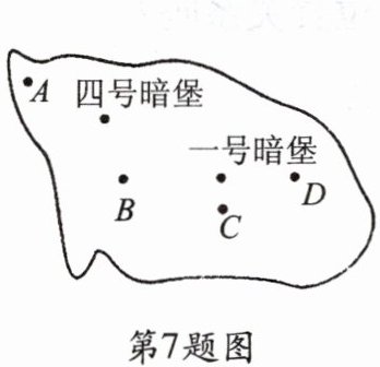 7. 如图所示,某战役缴获敌人防御工事坐标碎片,依稀可见:一号暗堡的坐标为$(4,2)$,四号暗堡的坐标为$( - 2,2)$,另有情报得知:指挥部坐标为$(0,0)$,你认为敌军指挥部的位置大约在何处? (