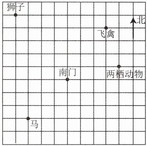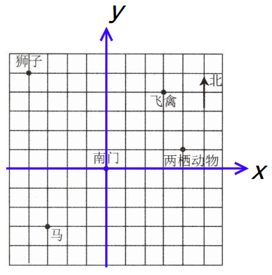 南门$(0,0)$,飞禽$(3,4)$,两栖动物$(4,1)$,