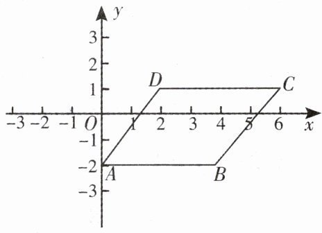 16. 如图所示,顺次连接$A(0, - 2)$,$B(4, - 2)$,$C(6,1)$,$D(2,1)$得到一个四边形,把这个四边形向$x轴负方向平移3$个单位长度,$A$,$B$,$C$,$D各点的对应点分别为A'$,$B'$,$C'$,$D'$,写出这四点的坐标.