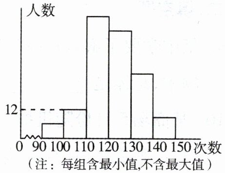 (1) 跳绳次数少于 100 次, 即第一组的频率为 $ 1 - 96\% = 4\% $, 即 0.04, $ 0.12 - 0.04 = 0.08 $, 所以这次共抽训了: $ 12 ÷ 0.08 = 150 $ (人).