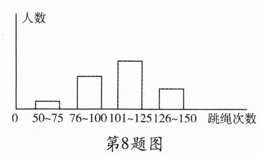 8. 为了了解七年级学生的体能情况,抽取了某校该年级的部分学生进行一分钟跳绳次数测试,将所得数据整理后,制成统计图(如图所示),从左到右前三个小组所占百分比分别为 10%,30%,40%,第一小组若有 5 人,则第四小组的人数是 (