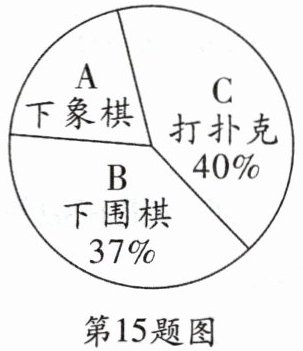 15. 如图所示的是某公司员工爱好的调查数据,$A$的百分比数据丢失,只知道喜欢$A$的有 23 人,则该公司的员工共有