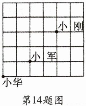 14. 课间操时,小华、小军、小刚的位置如图所示,小华对小刚说:“就你、我、小军我们三人的位置而言,如果我的位置用$(0,0)$来表示,小军的位置用$(2,1)$来表示,那么你的位置可表示成