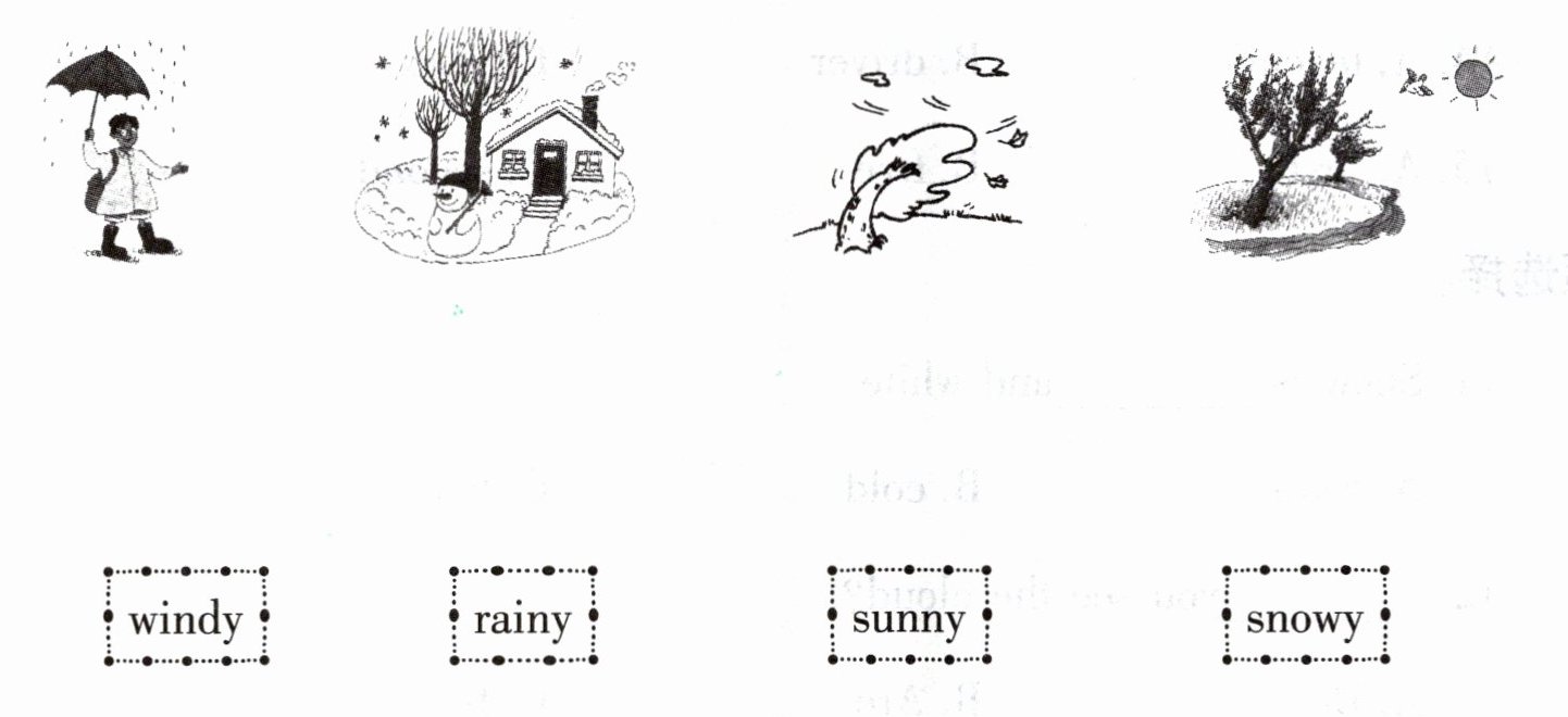 第一幅图连“rainy”;第二幅图连“snowy”;第三幅图连“windy”;第四幅图连“sunny”。