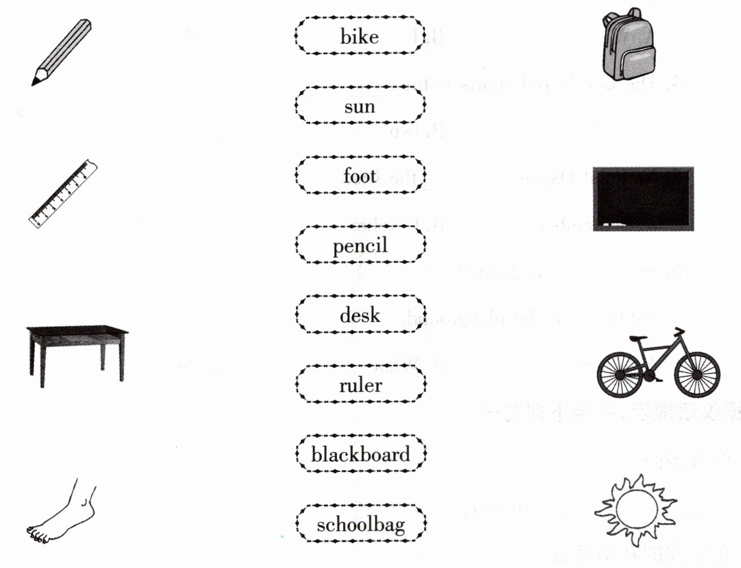 铅笔—pencil;尺子—ruler;桌子—desk;脚—foot;书包—schoolbag;黑板—blackboard;自行车—bike;太阳—sun。