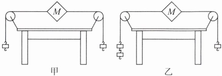 (2)当左右两端同时各挂1个钩码时,塑料片静止,如图甲所示,其左端受到的拉力$F_1$与右端受到的拉力$F_2$的方向______;当左端再挂上一个钩码时,如乙所示,塑料片将做______(选填“匀速”或“变速”)运动,此时塑料片受到的合力为______N。