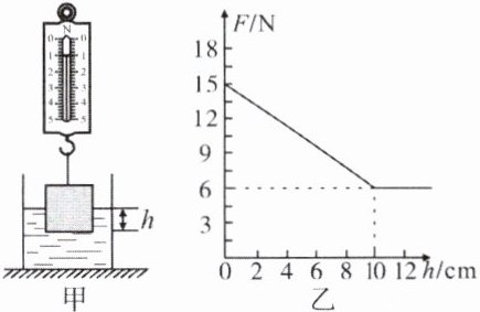 例3. 如图甲所示,用弹簧测力计通过细线拉着正方体物块缓慢浸入某未知液体中,物块受到的拉力$F与其下表面浸入液体中的深度h$之间的关系如图乙所示,则物块受到的重力为____N,物块刚好浸没在液体中时其下表面浸入的深度为____cm,未知液体的密度为____$kg/m^{3}$。($g取10N/kg$)