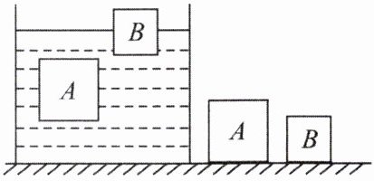 8. 质量分布均匀的$A$、$B两个实心正方体(V_{A}>V_{B})$,放置在盛水的容器中,静止时如图所示。现将$A$、$B$捞起后放置在水平桌面上,比较$A$、$B在水中受到的浮力F_{A}$、$F_{B}$,和它们对水平桌面的压强$p_{A}$、$p_{B}$的大小关系,正确的是()