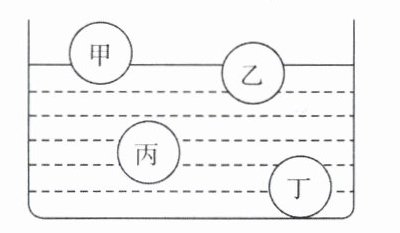 5. 体积相同而材料不同的小球甲、乙、丙、丁,静止在容器的水中,如图所示。这四个小球所受的浮力分别为$F_{甲}$、$F_{乙}$、$F_{丙}$、$F_{丁}$,则()