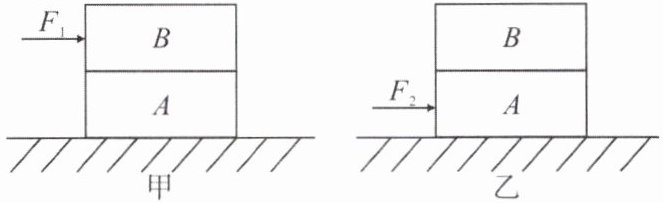 8. 如图甲所示,完全相同的$A$、$B$两物块叠放在水平桌面上,用$F_{1} = 30N的水平力作用在B$物块上,$AB$一起做匀速直线运动,此时$B$物块所受的摩擦力为____$N$;若将$F_{2} = 50N的水平力按如图乙所示作用在A$物块上,它们仍一起做直线运动,则地面对$A$物块的摩擦力为____$N$。
