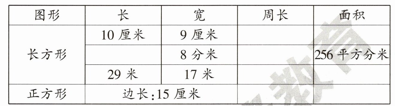 1. 对于第一个长方形,周长是两倍的长加宽,即$2× (10+9) = 38$(厘米),面积是长乘以宽,即$10× 9 = 90$(平方厘米)。