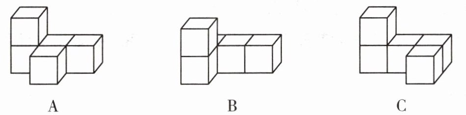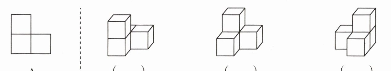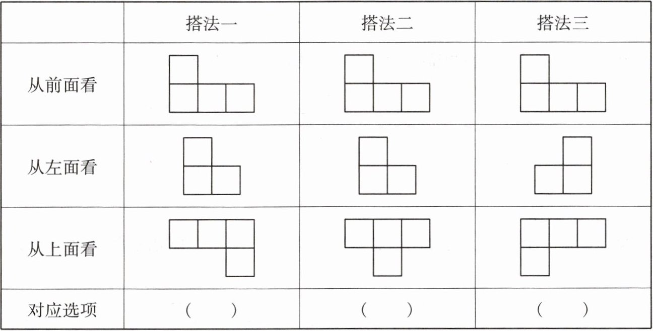 五、用5个大小相同的小正方体搭成下面三个几何体,从前面、左面、上面看到的图形如下表,请选择填空。