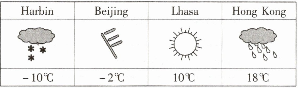 Hello, everyone. This is the weather report. Today is Monday. It's 1. ______in Harbin. It's -10 2. ______. It's very 3. ______. In Beijing, it's 4. ______. It's -2 degrees. In Lhasa, it's sunny and 10 degrees. It's 5. ______and cool in Hong Kong.
