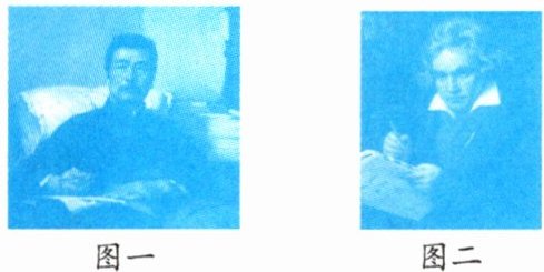 (1) 图一;鲁迅;他以笔为剑,刺破黑暗,唤醒民众,是中国现代文学的璀璨巨星。(或图二;贝多芬;他用音符谱写生命的华章,在失聪的困境中奏响命运的最强音,是音乐史上不朽的传奇。)