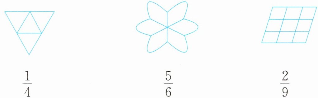 将第一个图形(大三角形)平均分成4个小三角形,涂其中1个小三角形;将第二个图形(花形)平均分成6个花瓣形状,涂其中5个花瓣形状;将第三个图形(平行四边形网格)平均分成9个小平行四边形,涂其中2个小平行四边形。