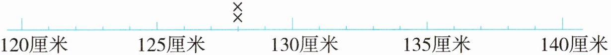 按照身高数据,在图中对应刻度位置画“×”,137厘米在135和140中间刻度画5个“×”;133厘米在130和135中间刻度画7个“×”;128厘米在125和130从左往右第3个小格画2个“×”。