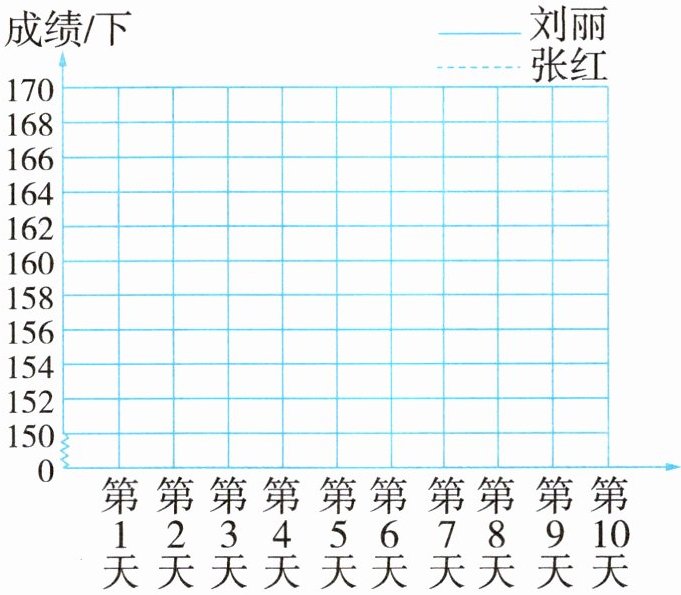 1. 绘制复式折线统计图:根据表格数据,在横坐标找到对应的天数,纵坐标找到对应的成绩,分别用实线(刘丽)和虚线(张红)依次连接各点。