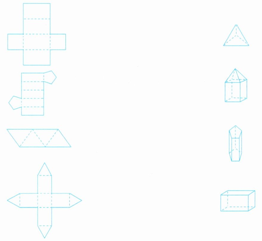 三、下图中,左面的四个展开图折叠后所围成的图形分别是右面哪一个立体图形?连一连。