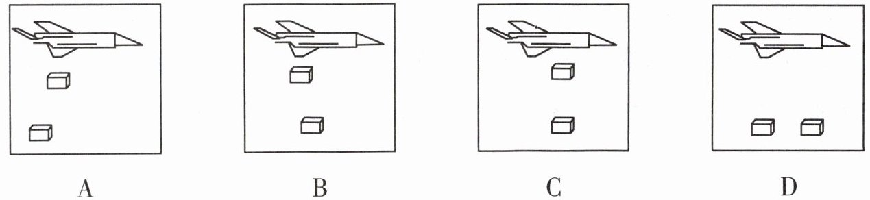 飞机在匀速飞行过程中空投救灾物资,相隔10s先后投下两个物体。若不计空气阻力,在落地前,下面能反映两物体及飞机间的相对位置关系的是()