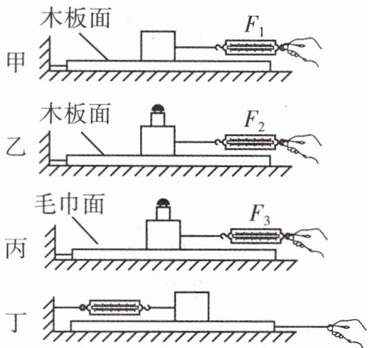 ③如图丙所示,在木板上铺上毛巾,从而改变接触面的粗糙程度,保持木块上的砝码不变,测出此情况下的滑动摩擦力。
