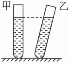 2. 甲、乙两个相同的试管分别装入水和酒精,如图所示,放置在水平桌面上,液面高度相同,均为 20 cm,则试管底部受到的压强$p_{甲}$______(选填“>”“=”或“<”)$p_{乙}$,甲试管底部受到的压强是______Pa。($\rho_{水}>\rho_{酒精}$,$g$取 10 N/kg)