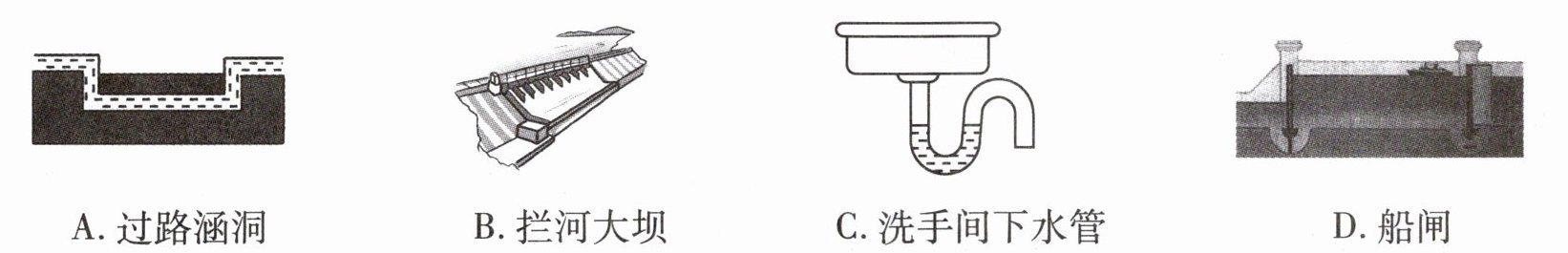 1. 连通器在日常生活、生产中有着广泛的应用。如图所示的实例中没有利用连通器原理的是()
