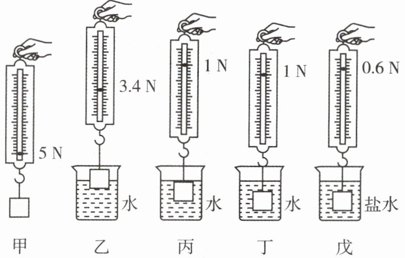 小明想做“探究影响浮力大小的因素”的实验,准备了如下实验器材:弹簧测力计、金属块、分别装有水和盐水的烧杯。实验装置和实验过程中弹簧测力计的示数如图所示。
