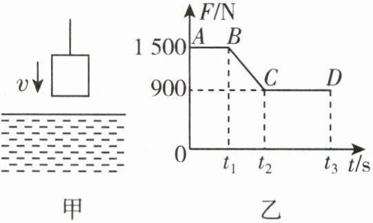 如图甲所示,石料在钢绳拉力的作用下从水面上方以恒定的速度下降,直至全部浸入水中。图乙所示是钢绳拉力随时间变化的图像,若不计水的阻力,求:(g 取 10 N/kg,$ρ_{水}= 1.0×10^{3}kg/m^{3}$)