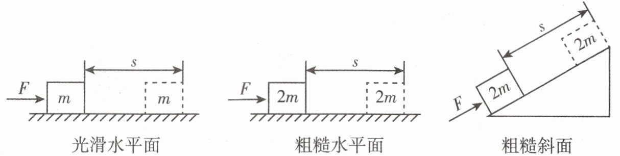 3. 一个人先后用同样大小的力 F 将不同质量的物体分别在光滑水平面、粗糙水平面和粗糙斜面上沿力的方向移动相同的距离 s(如图所示),该力在这三个过程中所做的功分别为$W_{1}$、$W_{2}$、$W_{3}$,关于它们之间的大小关系说法正确的是()