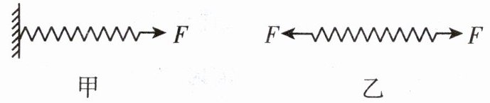 5. 一根轻质弹簧,左端固定在竖直墙壁上,右端受到大小为 $ F $ 的水平拉力,弹簧伸长 $ \Delta L_1 $,如图甲所示;再在同样的弹簧的左、右两端均施加大小为 $ F $ 的水平拉力,弹簧伸长 $ \Delta L_2 $,如图乙所示。若两根弹簧都水平静止,则 $ \Delta L_1 $______(选填“$ > $”“$ < $”或“$ = $”)$ \Delta L_2 $。(弹性形变均在弹性限度内)