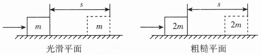 1. 如图所示,一个人先后两次用同样的时间、同样大小的力,将不同质量的物体在不同的表面上分别移动相同的距离。该力在此过程中所做功的大小分别为$W_{1}$、$W_{2}$,功率的大小分别为$P_{1}$、$P_{2}$,关于它们之间的大小关系说法正确的是()
