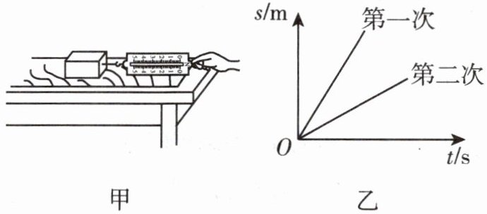 3. 如图甲所示,小明用弹簧测力计拉木块,使它沿水平木板匀速直线滑动,图乙是他两次拉动同一木块得到的距离随时间变化的图像。下列说法正确的是()