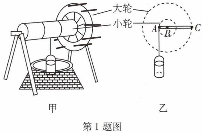 1. [跨学科]图甲是《天工开物》中记载的一种农业生产汲水装置——辘轳,图乙是它提水时的示意图,为方便提水,应按照______(选填“省力”或“费力”)杠杆来设计,支点是______(选填“A”“B”或“C”)点。