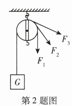 2. 如图所示,一根绳子绕过定滑轮,一端挂在重物G上,手执另一端,分别用力$F_1、$$F_2、$$F_3$拉起重物,则