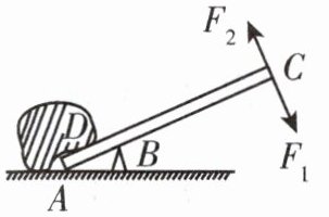 如图是人们用木棒撬石块的示意图。撬石块有两种方法:第一种是以B点为支点,在C点用与棒垂直的力$F_1$向下撬;第二种是以A点为支点,在C点用与棒垂直的力$F_2$向上撬。(木棒自重不计)