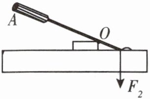 7. 如图所示,用螺丝刀撬起图钉。请在图上画出螺丝刀受到图钉阻力 $ F_{2} $ 的力臂,并画出作用在螺丝刀的刀柄上 $ A $ 点的最小动力 $ F_{1} $ 的示意图。